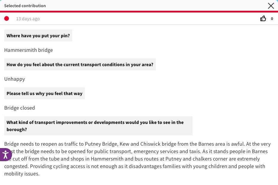 The second input - a survey - is no longer open. But you can read what people have said. Reading this list is not for the faint hearted - the entries are loaded, one after another. An initial analysis of these submissions was shared at the May Richmond council Transport Forum with a promise of making it available.