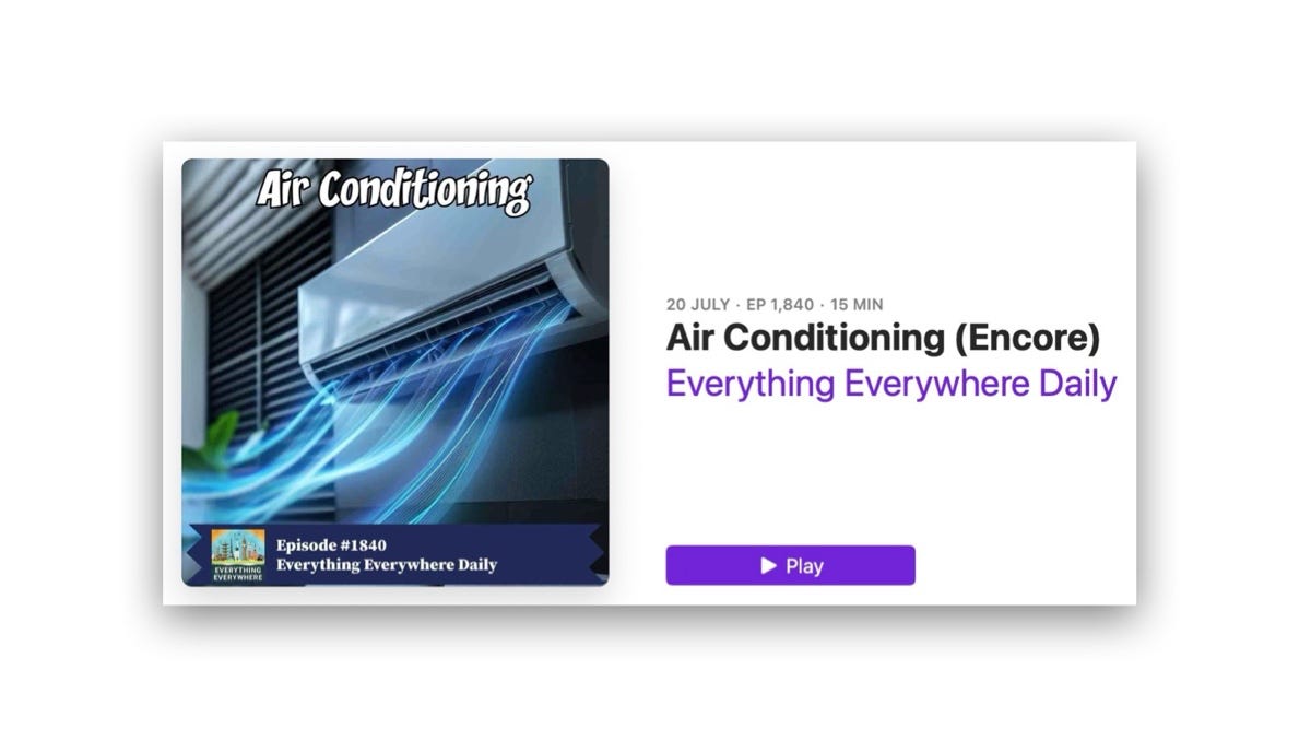 In the meantime, this short episode of Everything Everywhere Daily is a useful entry point. It sets out the basics of how air conditioning works, how it spread, and why it matters, especially now. This is an American story.