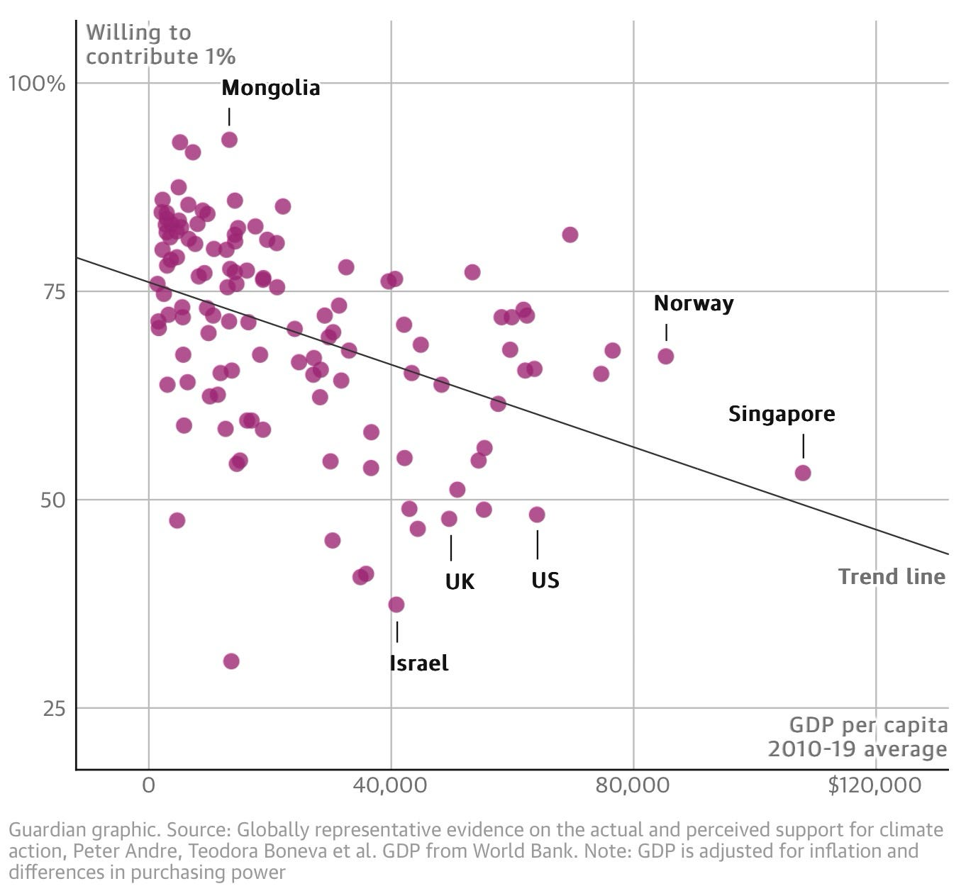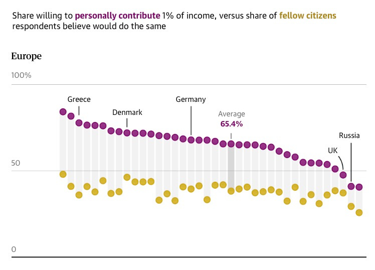 .. more than two-thirds said they were willing to give 1% of their income to fight the climate crisis. Crucially, however, they thought only a minority of other people – 43% – would be willing to do the same.