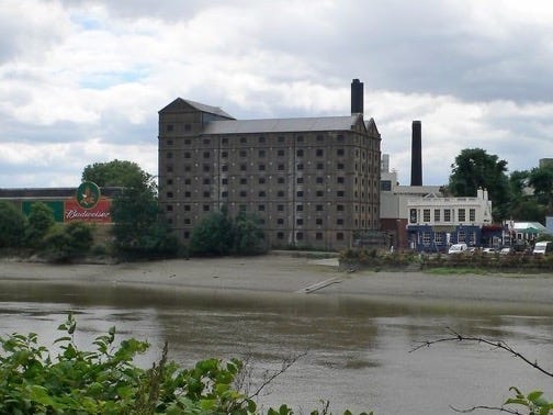 Welcome to the Stag Brewery in Mortlake. A landmark. If you have ever watched the Boat Race on television, you may have seen it. The building is on the south bank about 300m from the finish line.
