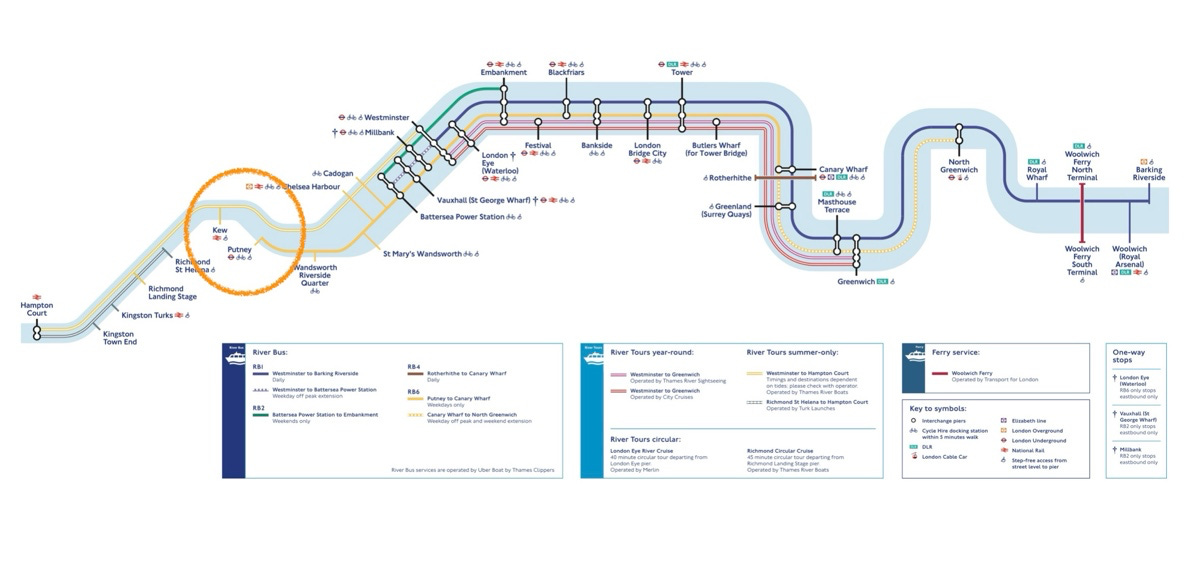 TfL’s services are characterised as either River Buses or River Tours. The latter includes five sightseeing services inlcuding Thames River Boats which are stopping, occasionally, at Chiswick Pier. There are also two speedboats and daytime and evening dinner cruises.