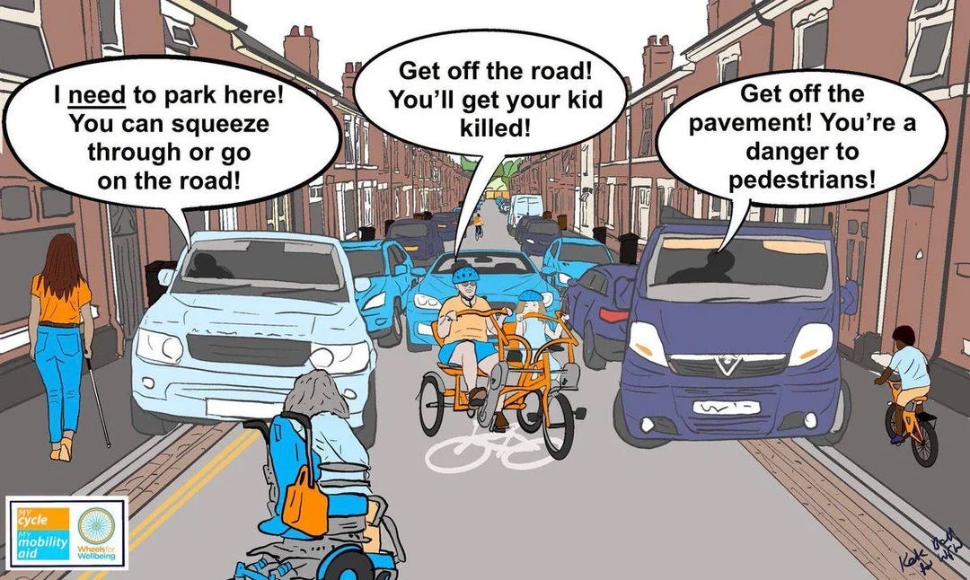 why parking is treated as a baseline entitlement, while crossing the road safely is framed as a nice-to-have