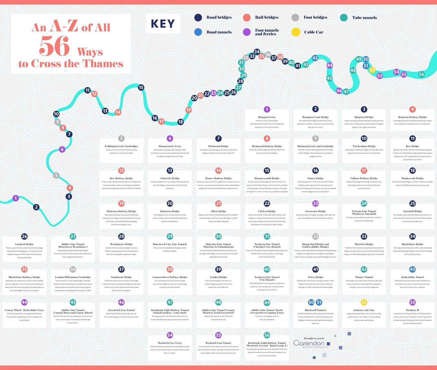 Despite the river’s centrality to London’s geography and infrastructure, comprehensive maps of its crossings are surprisingly hard to come by. One of the most complete—and perhaps most unexpected—resources comes not from a government agency or transport authority, but from Clarendon Apartments, the suppliers of extended stay apartment accommodation for business travellers.