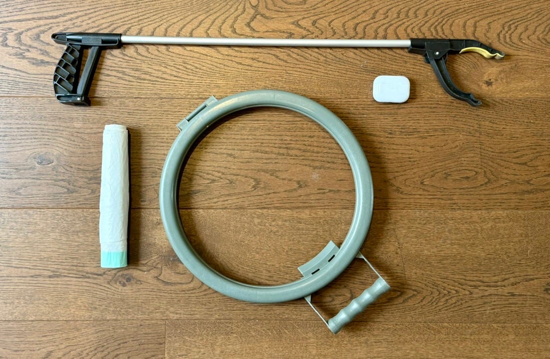 My patch is modest: a handful of streets near my home, and I’ve been tending to it for years. Twice a week - Tuesday, the day after bin day, and Friday, as the working week closes - I head out with a picker, a hoop, and a kitchen bin liner. AirPods in, a podcast on, I stay until a bag is full or 45 minutes pass. I collect only the inorganic: the plastics, cans, wrappers, and the endless detritus of modern life.