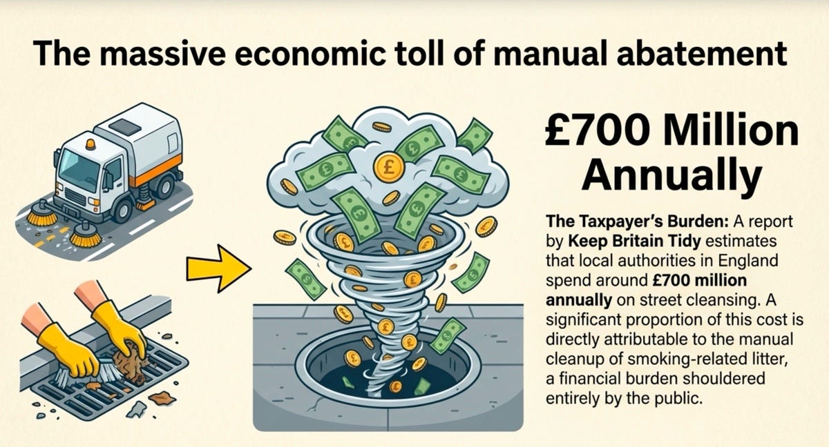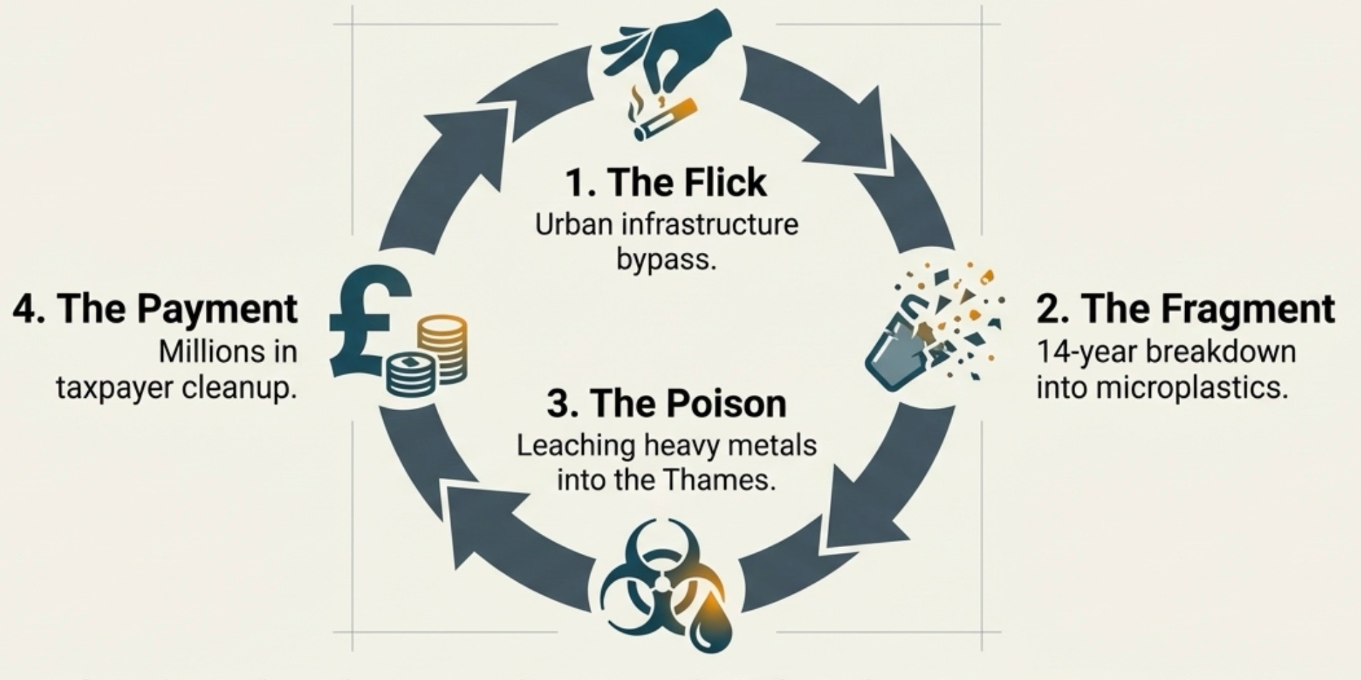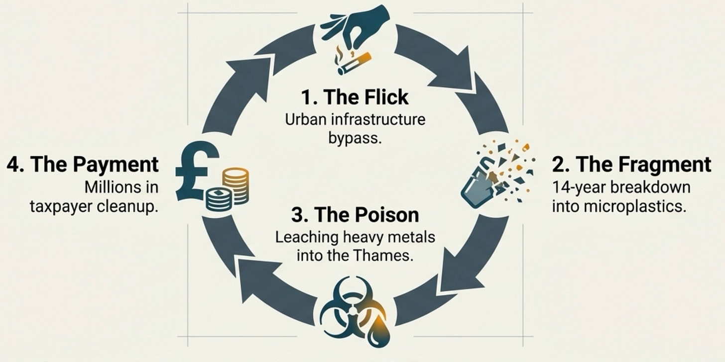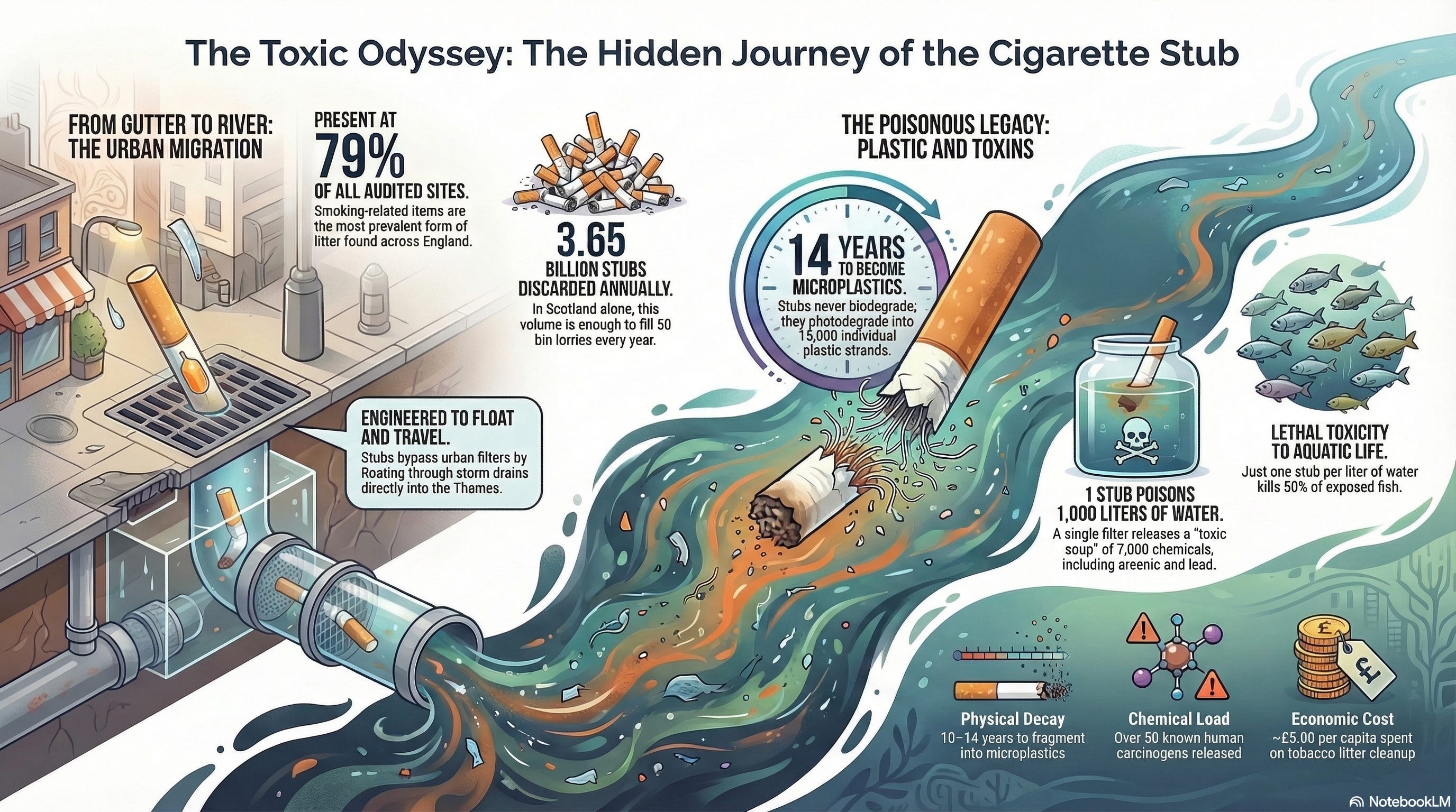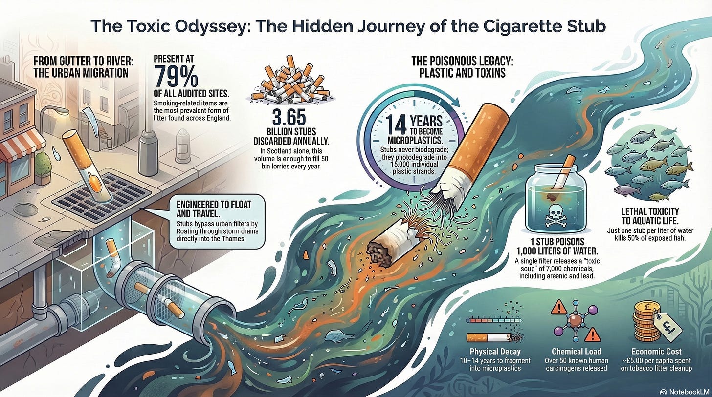 The scale of the damage is startling. A single butt may contaminate up to a thousand litres of water. As the filter breaks down over many years, it can release microplastics into the wider environment.