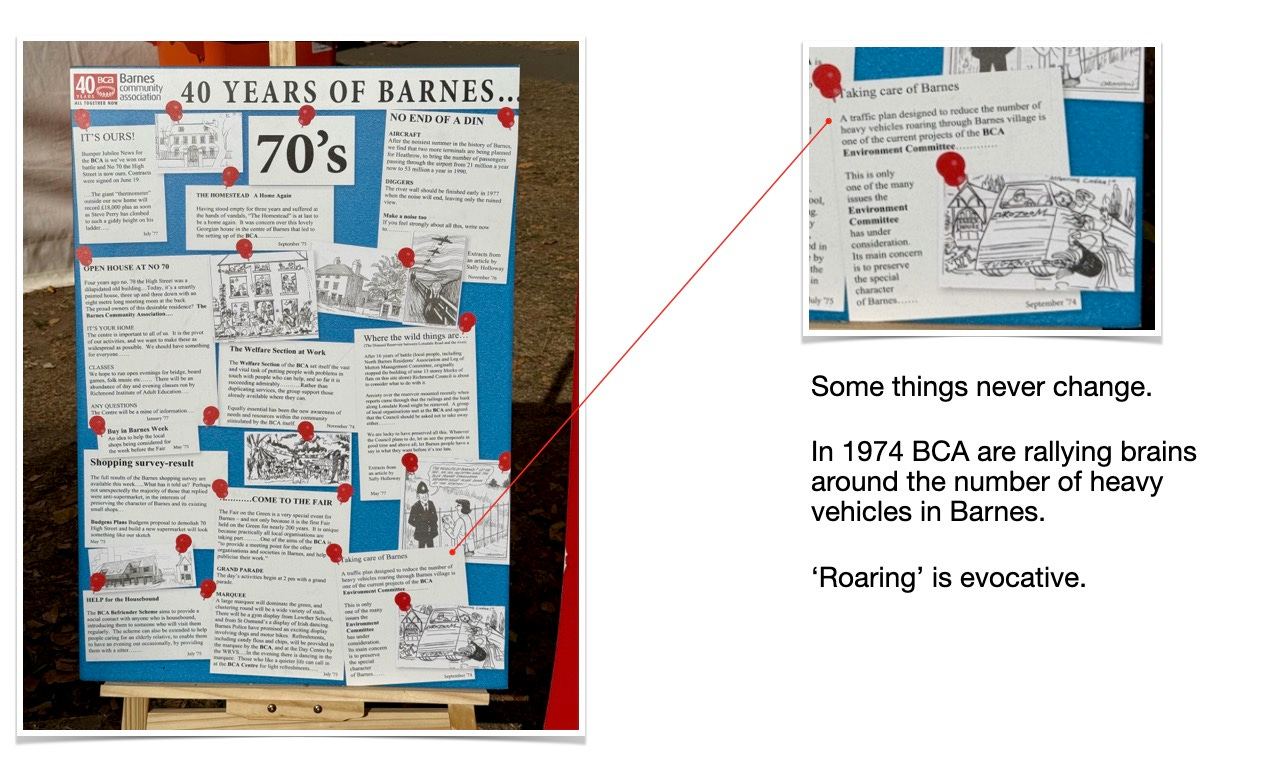 This was the fiftieth edition. To mark the anniversary, Barnes Community Association (BCA) positioned four posters by their tent showing what they’ve been up to since the 1970s.