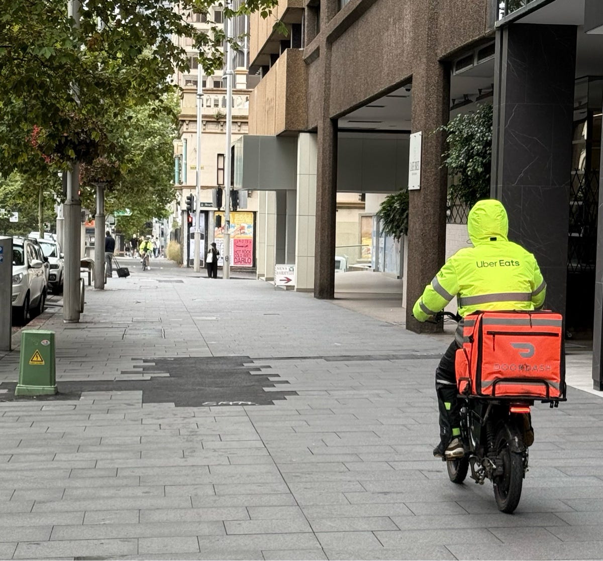 This is a poor photo because I was surpised by the bell-ringing behind. Such a wide pavement why did the Uber rider have to ride towards me? This rider was not making a delivery. I followed him into the distance, on the pavement all the way. If you look to the distance you can see another cyclist heading towards me.