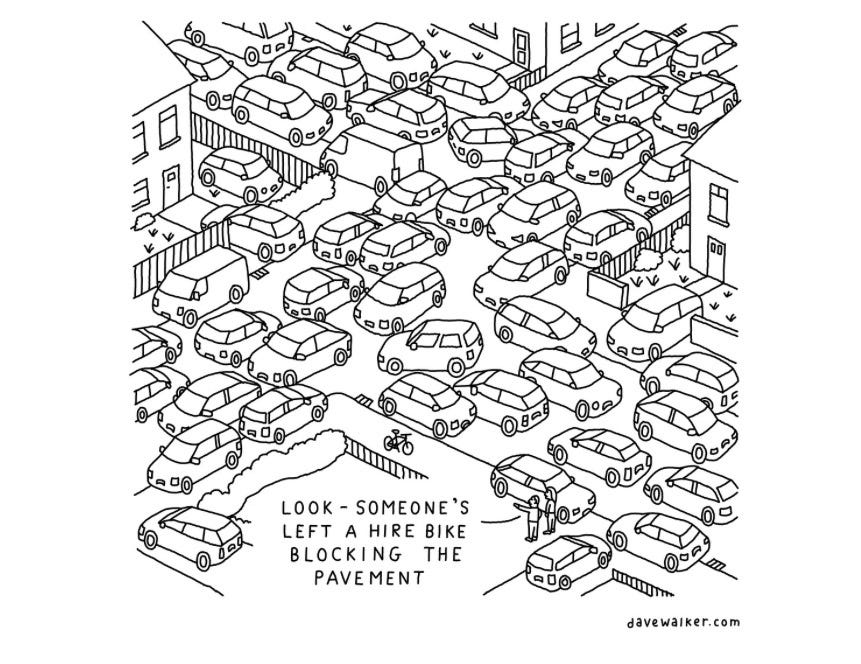 So yes, please don’t block the pavement with a hire bike, but also don’t block it with a car.