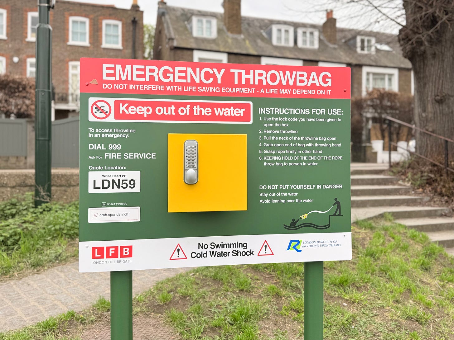 It is one of nine emergency panels installed along the towpath between the White Hart and Barn Elms. As Richmond councilexplains, the panels house emergency throwline equipment that can be used to help someone in trouble in the water.