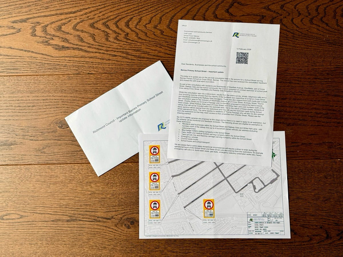 If this is the first School Street in Barnes, it is also another step in making this kind of active space management feel normal for something other than roadworks. Bridged’s view is that there will be more of it in future: more timed access, more reallocation, more experimentation, and more arguments about who public space is for.